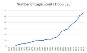 In 1965, Troop 325 honored its first Eagle Scout, Michael R. Rose. Over the years, the troop has celebrated more and more Eagle Scouts, from 56 in 2004 to 134 in 2023.