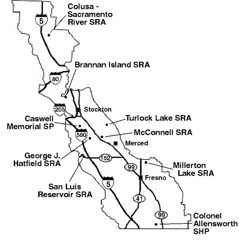 This region includes Yolo, Solano, San Joaquin, Stanislaus, Merced, Fresno, Madera, Kings, and Tulare Counties. Where to go Camping -Map-3- Miwok Lodge 439